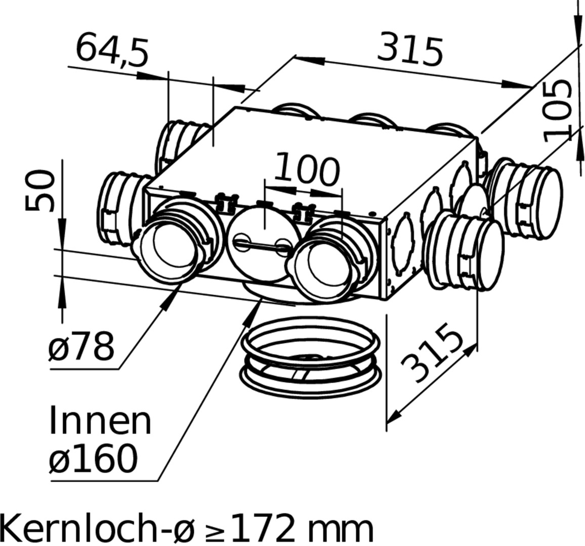 Ø 75 mm, für universellen Einbau in Rohrbetondecke, Rohranbindung DN (RVB 160 l) oder DN 125 (RVB 160/125) möglich, große Revisionsöffnung für Reinigung