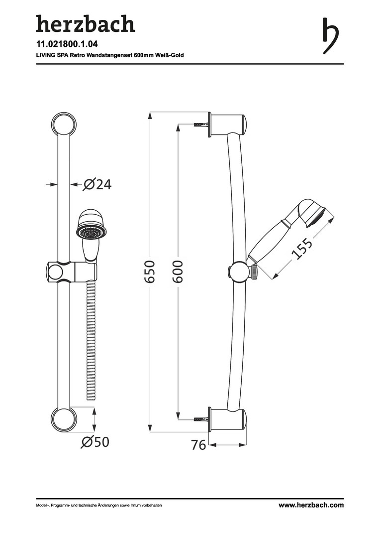 Herzbach Brausegarnitur Living Spa Retro 600mm, mit Handbrause 1-strahlig, weiß-gold