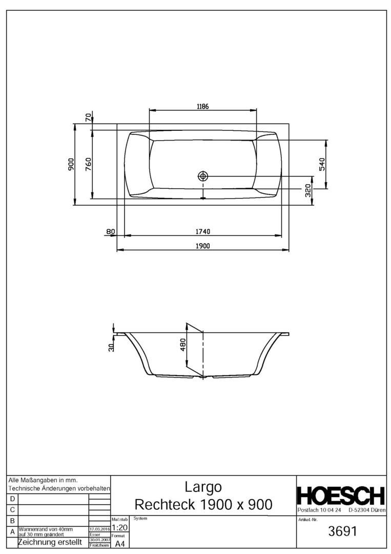 Hoesch Badewanne Largo weiß, 190 x 90 cm, 210 l