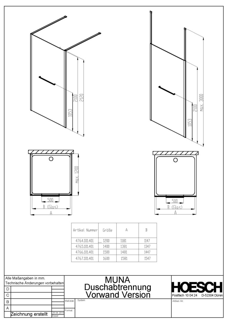 Glasstärke 8 mm, horizontale (Wand-) bzw. vertikale (Decken-) Befestigung möglich, Griff enthalten