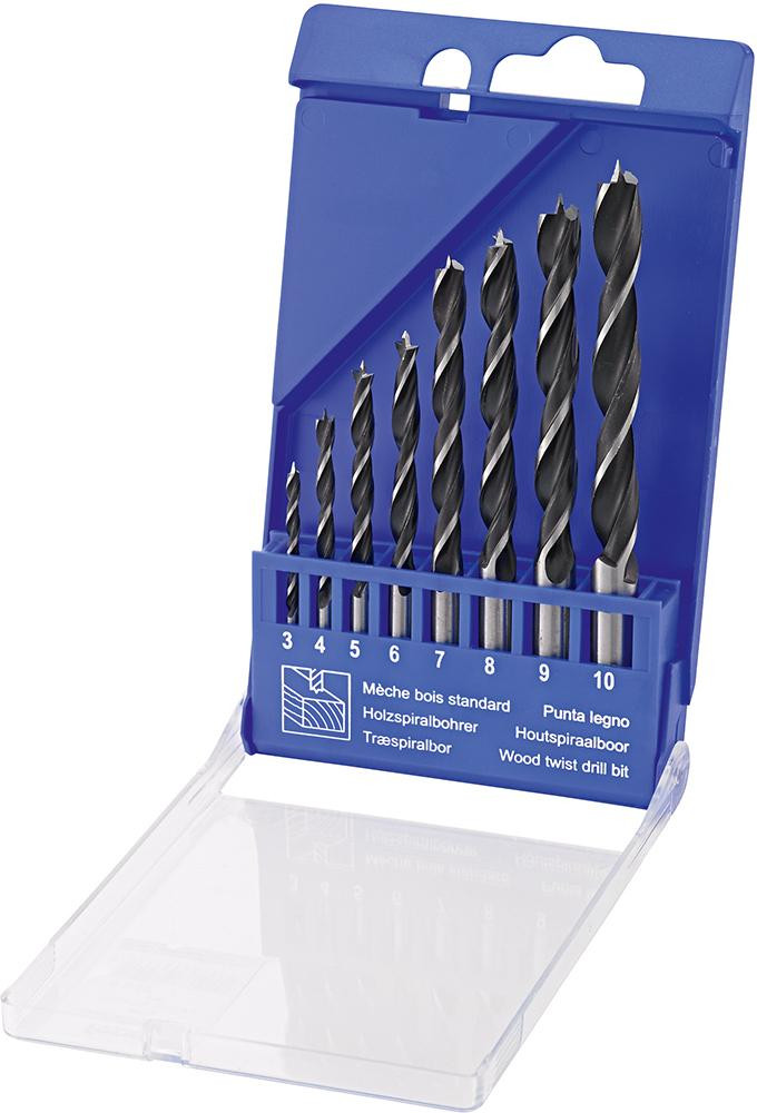 Inhalt: 8 Holzspiralbohrer 3; 4; 5; 6; 7; 8; 9; 10 mm.