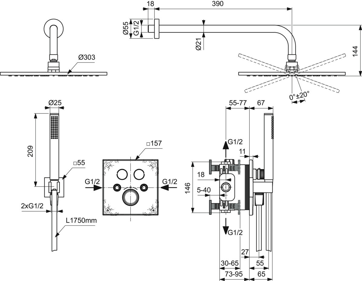 Armaturen-Paket bestehend aus A7302.. - Brausethermostat Unterputz Bausatz 2 für Fertigmontage, zwei Entnahmestellen, Rückflussverhinderer, Unterputz-Bausatz 1 Easy-Box zur Montage benötigt (A1000NU - separat erhältlich), Griffe aus Metall, Öffnen/Schließen per Knopfdruck, Volumenkontrolle durch Drehen (Navigo), gleichzeitiger Betrieb beider Kanäle möglich, Rosette 157x157 mm, Thermostatkartusche mit Wachsdehnstoffelement, Heißwassertemperaturbegrenzer, Temperatursperre 40 °C, DICHT-FIX System separate Abdichtung jeder Öffnung für optimalen Schutz des Bauwerks gegen Feuchtigkeit und Wasser, Geräuschverhalten Gruppe 1, für eine Verwendung als Badearmatur ist eine separater Rohrtrenner erforderlich, Gewicht 2,101 kg, A1000.. - Unterputz-Bausatz 1 Easy-Box für Unterputz-Einhebelmischer und Thermostate (mit Navigo) Bausatz 2, Wandeinbau, Vormontage im Rohbau, mit Putzschablone und Spülblock, Anschlüsse G1/2, DZR entzinkungsbeständig, Einbautiefe 73-95 mm, Höhenversteller 5-40 mm, Geräuschverhalten Gruppe 1, Gewicht 0,986 kg, BC771.. - Wandanschlussbogen Unterputz, mit Brausehalter, Rückflussverhinderer, DVGW-eigensicher, Brauseschlauchanschluss G1/2, Wandanschluss G1/2, Gewicht 0,330 kg, BE175.. - Brauseschlauch, Idealflex, Anschluss G1/2, Gewicht 0,353 kg, BC774.. - Stabhandbrause, 1-Funktion, EasyClean, Anschluss G1/2, Gewicht 0,176 kg, A5805.. - Regenbrause, 300x300 mm, Kugelgelenk, EasyClean, Anschluss G1/2, Gewicht 2,500 kg, B9445.. - Wandanschluss, Anschluss G1/2