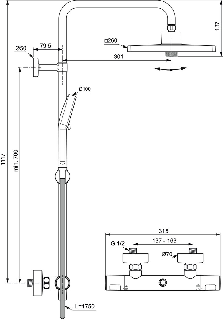 Duschsystem mit Brausethermostat Aufputz DN 15, Regenbrause mit 2-Funktionen, 260 x 260 mm | Strahlarten sind sanfter Regen und Regen, mit Drehumschaltung, mit Kugelgelenk, EasyClean, 2-Funktion Handbrause, Ø 100 mm, Strahlarten: Massage und sanfter Regen, Drehumschaltung, EasyClean, wasserführende Brausestange, mit Wandbefestigung, Brausehalter verstellbar mit Drehknopf, Brauseschlauch Idealflex 1750 mm , Anschluss G1/2, Brausethermostat Aufputz DN 15, Rückflussverhinderer, DVGWEigensicher, Cool Body, S-Anschlüsse (verstellbar), Griffe aus Kunststoff | PreciTherm-Thermostatkartusche, Heißwassertemperaturbegrenzer, Heißwassertemperatureinstellung mit Verbrühschutz, RV Patrone auf der Warmwasserseite mit integriertem Überdruckventil (Druckentlastung größer 16 bar), Umschaltung Handbrause/Regenbrause integriert, Geräuschverhalten DIN 4109 Gruppe 1, Lebensdauer DIN EN 200, DIN EN 1111, Gewicht 3,463 kg