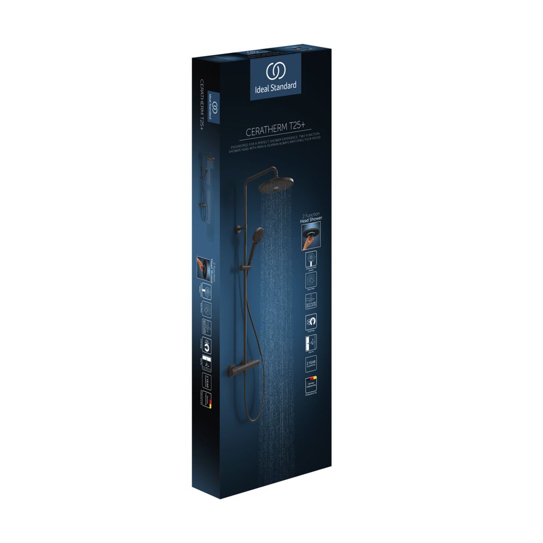 Ideal-Standard Duschsystem Ceratherm T 25+ mit Brausethermostat, 2F-Handbrause, Kopfbrause rund, silk black