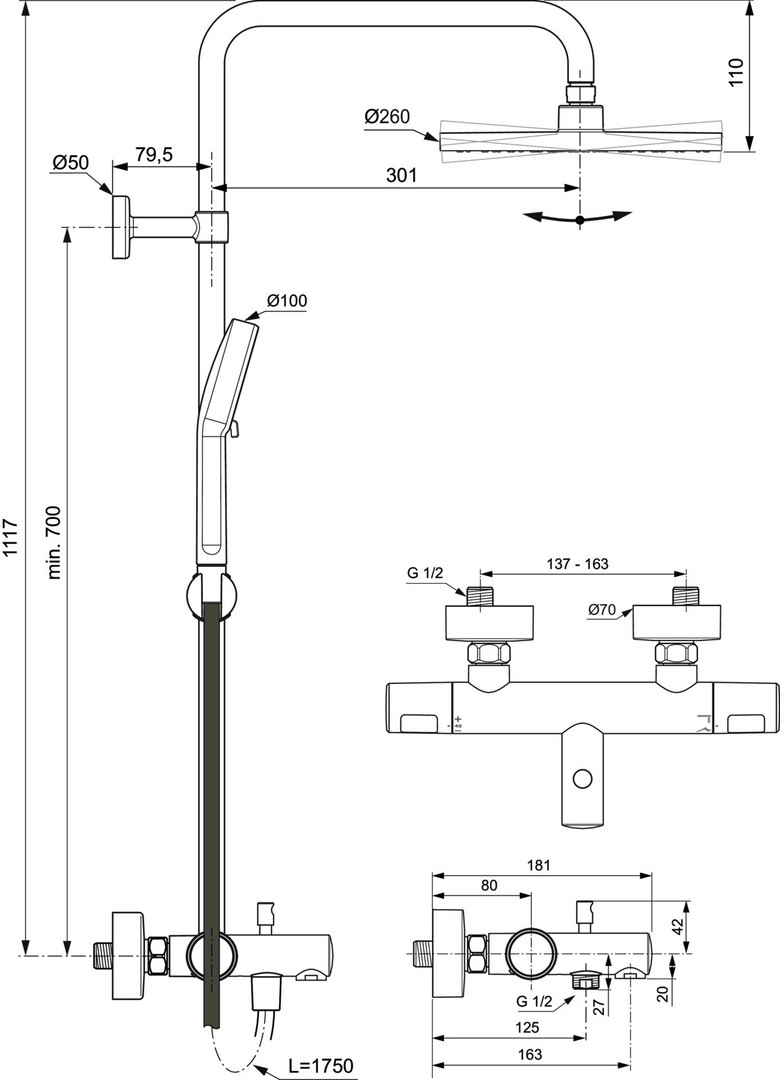 Duschsystem mit Badethermostat Aufputz DN 15, Regenbrause Ø 260 mm mit Kugelgelenk und EasyClean, Handbrause 2-Funktion,Ø 100 mm, mit Strahlarten Massage und sanfter Regen, Drehumschaltung, EasyClean, wasserführende Brausestange, mit Wandbefestigung, Brausehalter verstellbar mit Drehknopf, Brauseschlauch Idealflex 1750 mm, Anschluss G1/2, Badethermostat Aufputz DN 15, Rückflussverhinderer cool Body, PreciTherm-Thermostatkartusche, Heißwassertemperaturbegrenzer, RV Patrone auf der Warmwasserseite mit integriertem Überdruckventil (Druckentlastung größer 16 bar), Umschaltung Wanne/Handbrause/Regenbrause integriert, Gewicht 3,463 kg
