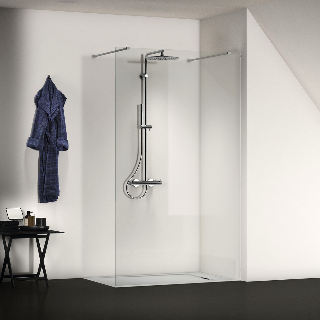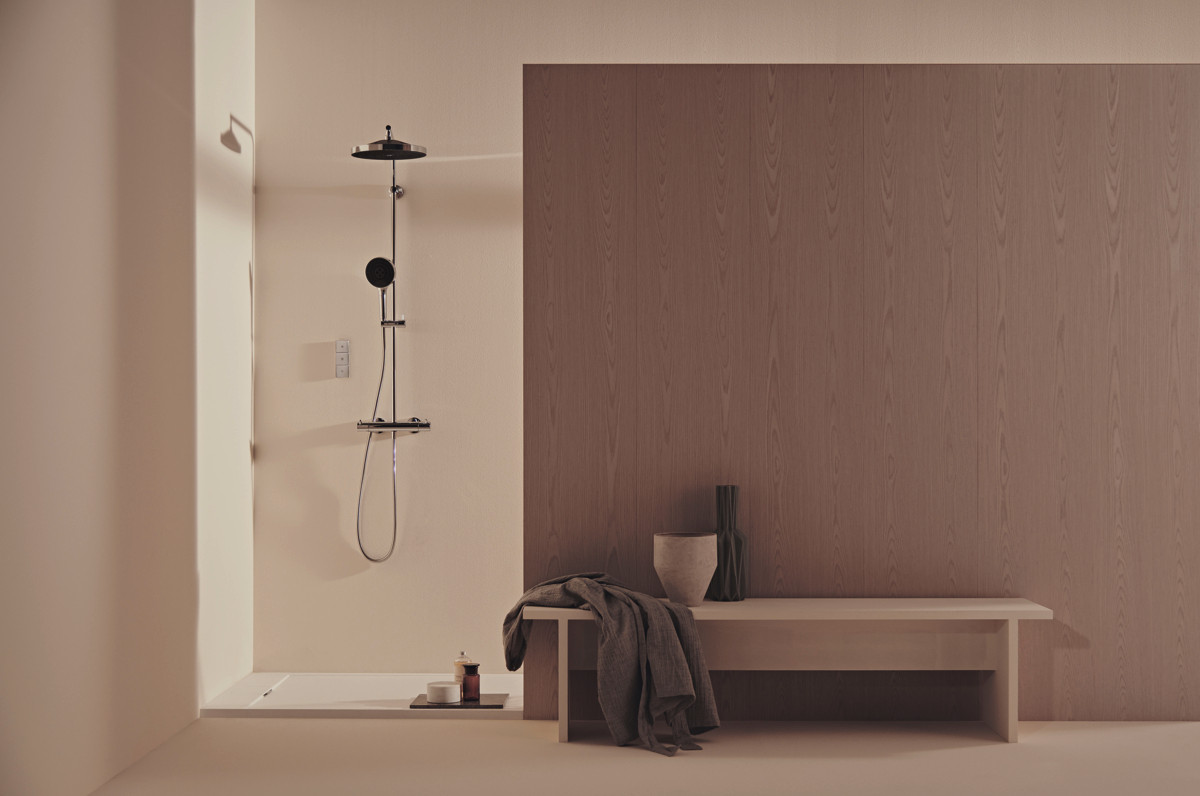 Aufputz DN 15, Regenbrause, Ø 300 mm, mit Kugelgelenk, EasyClean, Stabhandbrause 1-Funktion, EasyClean, wasserführende Brausestange, mit Wandbefestigung, Brausehalter verstellbar mit Druckknopf, Brauseschlauch Idealflex 1750 mm, Anschluss G1/2, Brausethermostat Aufputz DN 15, Rückflussverhinderer, DVGW-Eigensicher, Cool Body, S-Anschlüsse (verstellbar), Griffe aus Metall, Thermostatkartusche mit Wachsdehnstoffelement, Heißwassertemperaturbegrenzer, Heißwassertemperatureinstellung mit Verbrühschutz, RV Patrone auf der Warmwasserseite mit integriertem Überdruckventil (Druckentlastung größer 16 bar), Umschaltung Handbrause/Regenbrause integriert, Geräuschverhalten Gruppe 1