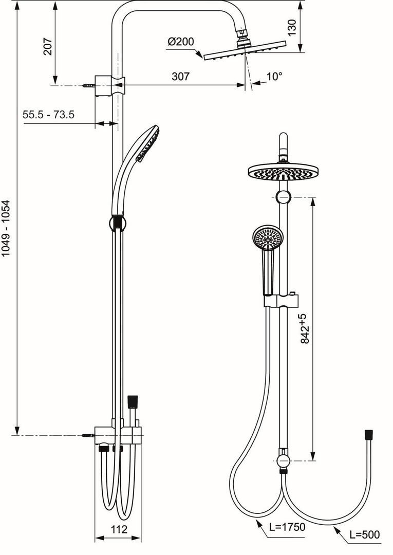 zur Kombination mit Wandanschlussbogen, mit verstellbarer Wandhalterung 54,5-73,5 mm, Kopfbrause aus Metall Ø 200 mm und 3-Funktionshandbrause Ø 100 mm, Anti-Kalk-Funktion, wasserführende Brausestange mit schwenkbarem Druckknopf-Schieber, Brauseschlauch Idealflex 1750 mm, Verbindungsschlauch Idealflex 500 mm, Anschluss G 1/2 verdeckt, Umschaltung integriert