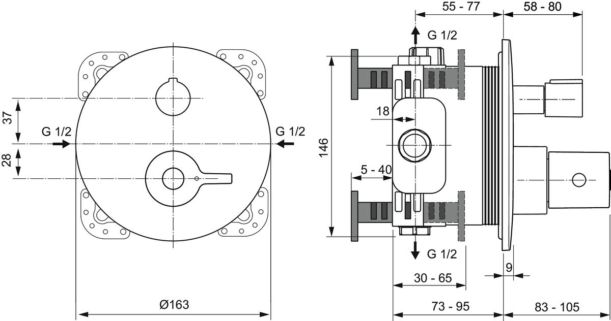 für Wandeinbau, Bausatz 2 für Fertigmontage, Absperrung für eine Entnahmestelle, Rückflussverhinderer, Unterputz-Bausatz 1 zur Montage benötigt (A1000NU - separat erhältlich), Griff aus Metall, Rosette Ø 163 mm, Seitenventile zur Vorabsperrung, Thermostatkartusche mit Wachsdehnstoffelement, Heißwassertemperaturbegrenzer, Temperatursperre 38 °C, DICHT-FIX System separate Abdichtung jeder Öffnung für optimalen Schutz des Bauwerks gegen Feuchtigkeit und Wasser, Geräuschverhalten DIN 4109 Gruppe 1, Lebensdauer DIN EN 817