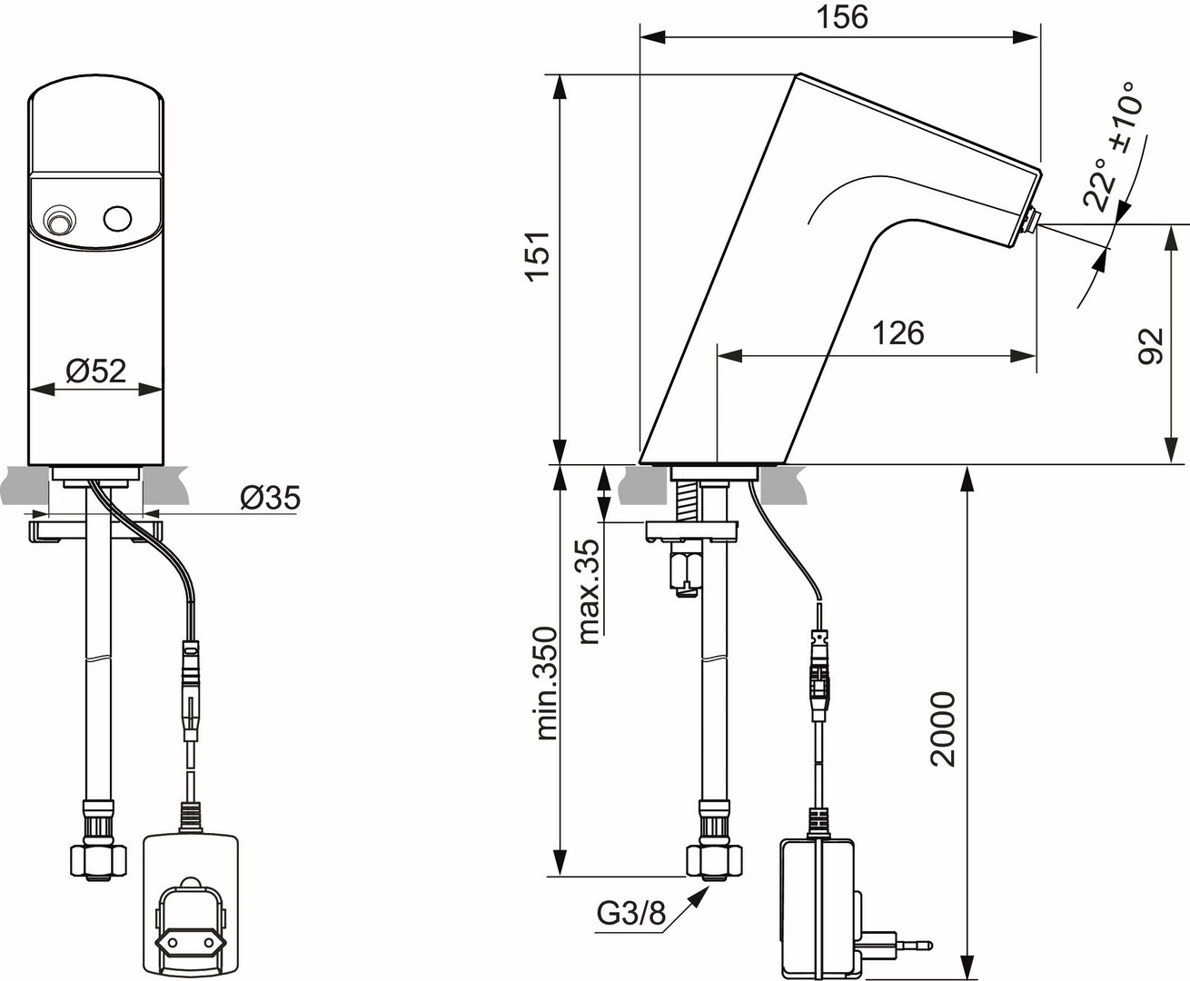 DN 15, Ausladung 126 mm, Auslaufhöhe 92 mm, Laminarstrahlregler (sichtbar), Schnellmontagesystem, ohne Ablaufgarnitur, automatischer Spülzyklus, Steuerungsart Infrarot, Frequenz Spülzyklus 6-72 Stunden, Spülzeit einstellbar von 1 bis 60 Sekunden, Tastweite 50-250 mm, Sicherheitsstopp nach 55 Sek. Daueraktivierung, geeignet für thermische Desinfektion, Norm DIN EN 248, Geräuschverhalten DIN 4109 Gruppe 1, Lebensdauer DIN EN 200