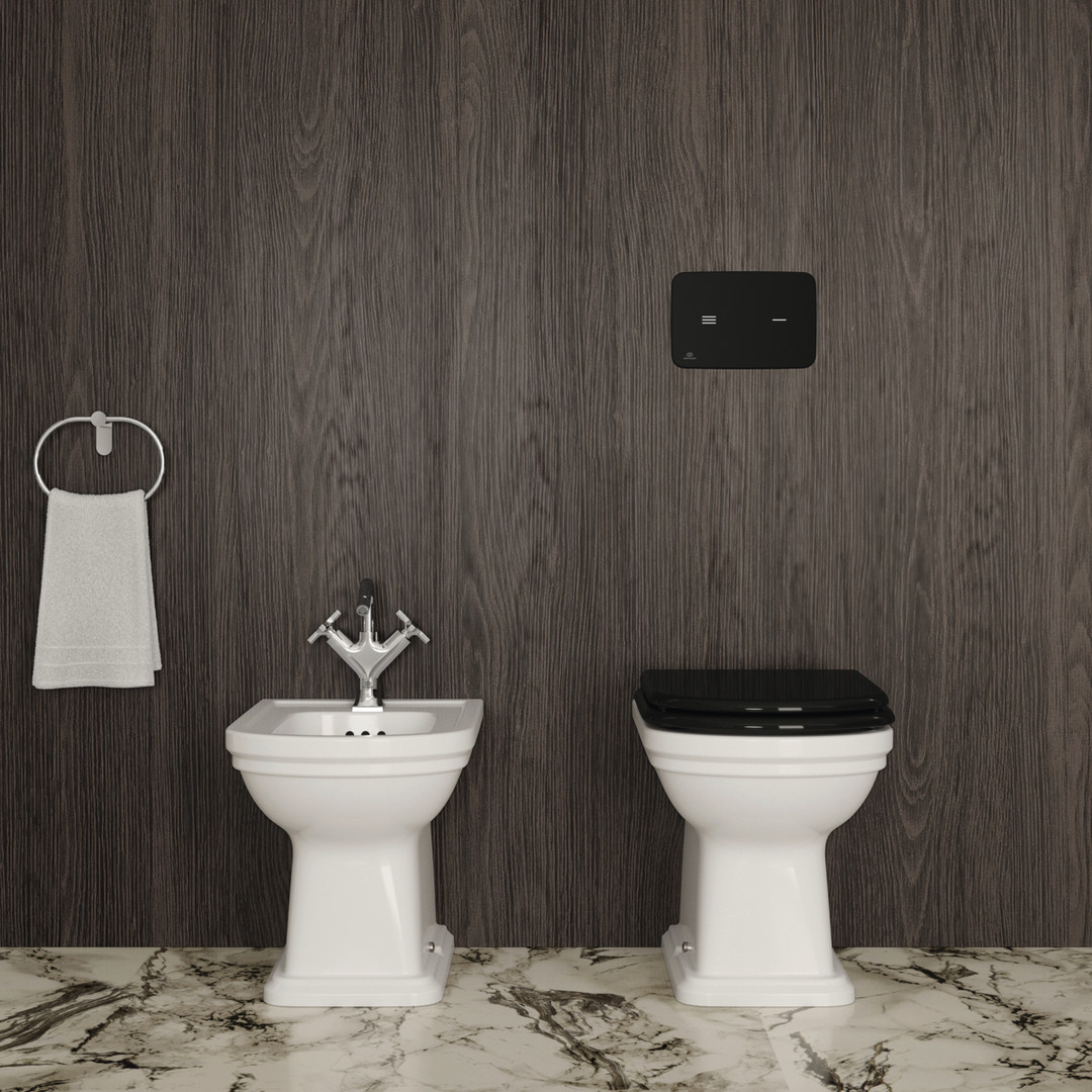 Kristallporzellan, glasierter geschlossener Spülrand, kompatibel mit UP-Spülkasten, Spülwassermenge 4,5/6 l, Wasserausgang horizontal hinten verdeckt, Zulauf-Anschlußposition hinten verdeckt, mit Befestigung (TT0257919), Norm DIN EN 33, DIN EN 997 CL1-5A/6A + CL2