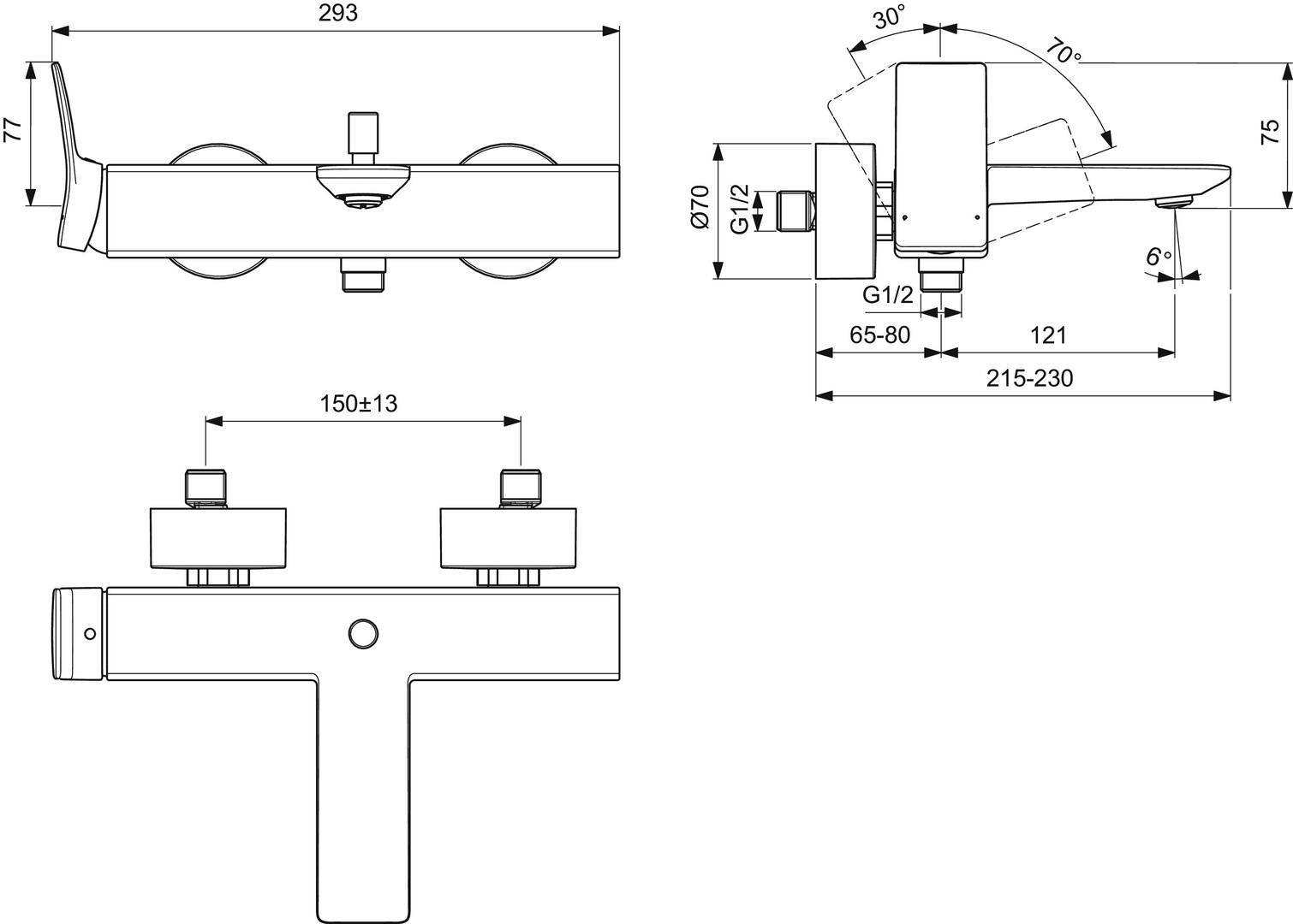 DN 15, Ausladung 121 mm, Luftsprudler (sichtbar), Griff aus Metall, S-Anschlüsse (verstellbar), Kartusche Ø 38 mm, Kartusche mit keramischen Dichtscheiben, Kartuschenschwenkbereich 100°, Kartuschenübersetzung aus Edelstahl, Heißwassertemperaturbegrenzer, DVGW-eigensicher, mit 2 Rosetten (rund) aus Metall, Anschlussmaß Brauseschlauch 1/2 Zoll, mit Zugumsteller Wanne/Brause, Geräuschverhalten DIN 4109 Gruppe 1, Lebensdauer DIN EN 817, DIN EN 200