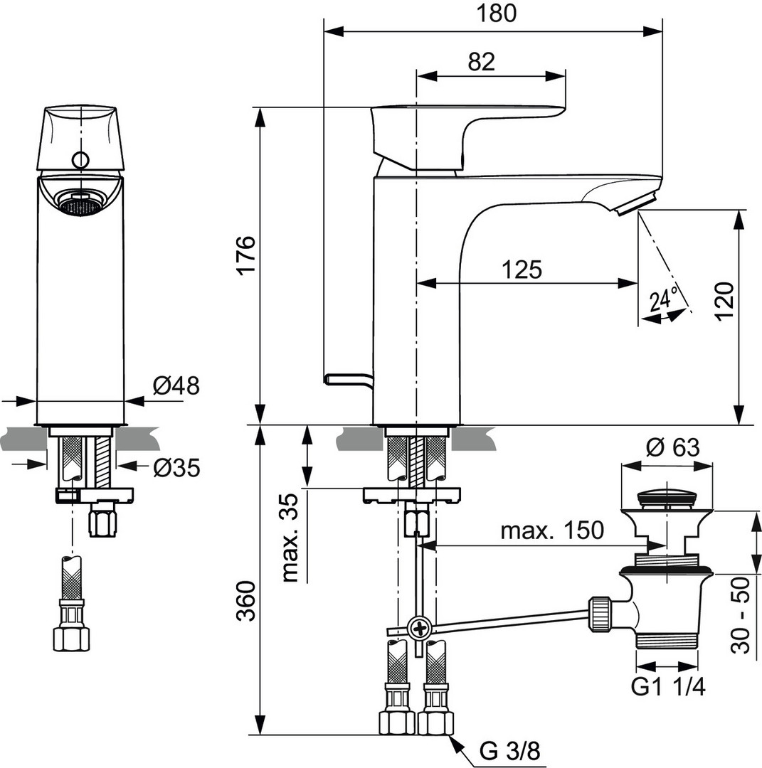 DN 15, Ausladung 125 mm, Auslaufhöhe 120 mm, Luftsprudler (sichtbar), Metall-Zugstangen-Ablaufgarnitur G 1 1/4, flexible Anschlussschläuche G 3/8, Griff aus Metall mit Rot-/Blau-Markierung, Schnellmontagesystem, Kartusche Ø 38 mm, Kartusche mit keramischen Dichtscheiben, Kartuschenschwenkbereich 100°, Kartuschenübersetzung aus Edelstahl, Heißwassertemperaturbegrenzer, Norm DIN EN 248, Geräuschverhalten DIN 4109 Gruppe 1, Lebensdauer DIN EN 817, DIN EN 200