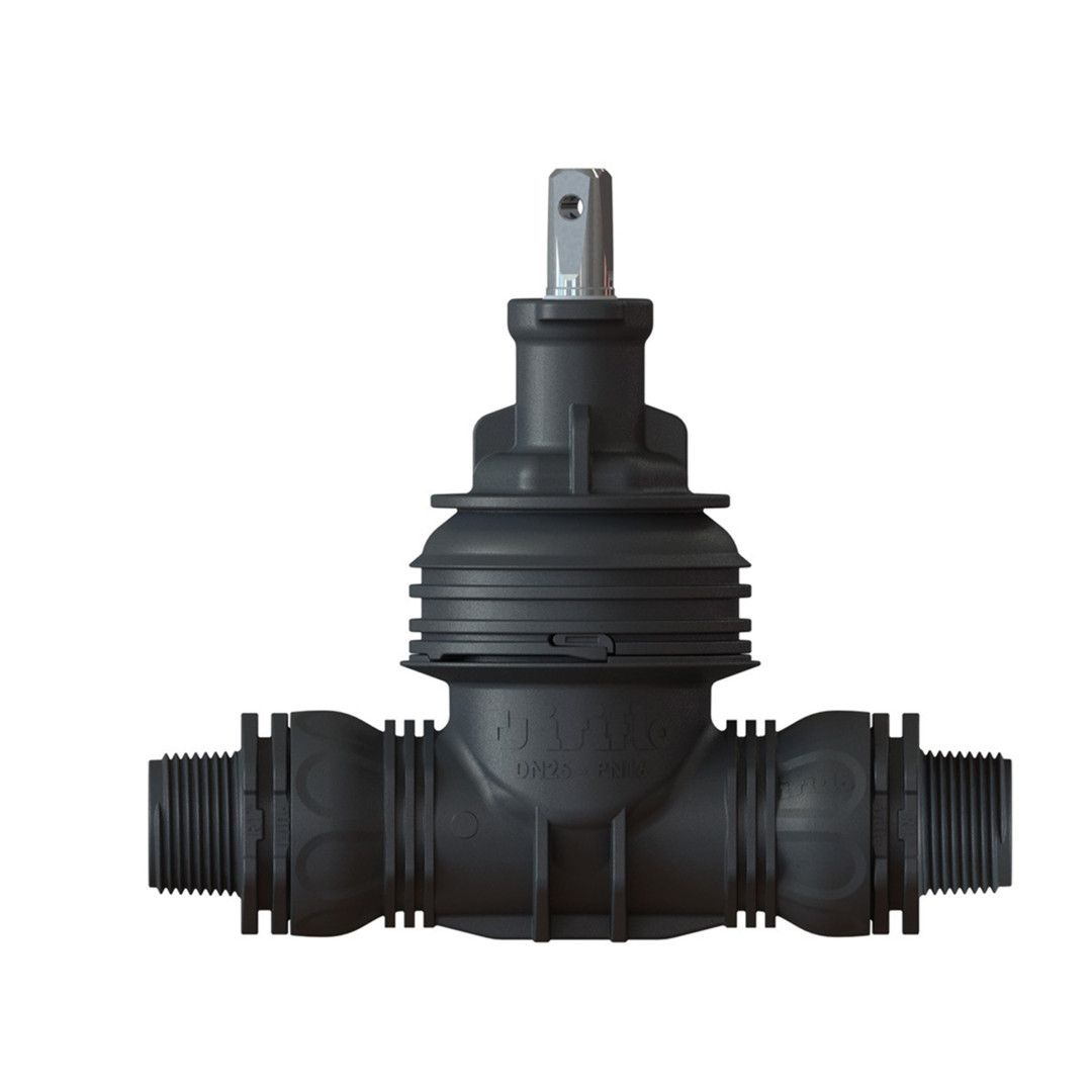 Isiflo Sprint ECO Line patentierter AG-AG Keilschieber 1" x 1" Typ 297 aus faserverstärktem Polyamid, Betriebstemperatur 0 bis 40 Grad, Betriebsdruck max. 16 bar