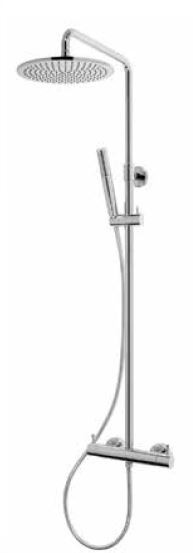 bestehend aus Teleskop-Regenbrauserohr, schwenkbar, mit höhenverstellbarem Handbrausehalter mit Stabhandbrause, Metall-Brauseschlauch 150 cm, Brausethermostat mit integriertem, keramischem Mengenregulier- und Umstellventil für Abgang oben und unten (Kopfbrause/Handbrause), austauschbare Dehnstoff-Temperaturregeleinheit mit Heißwassersperre 38 °C, vollverdeckte S-Anschlüsse