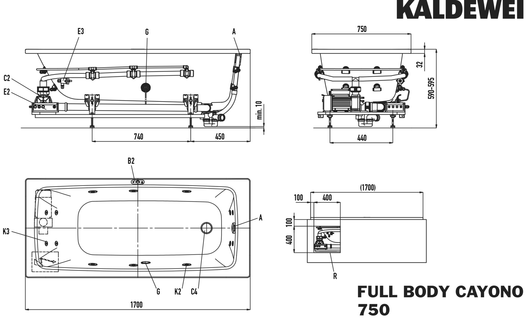 KALDEWEI CAYONO, Mod.750 FULL BODY 1700x750mm, alpinweiß, rechts, Sichtteile chrom