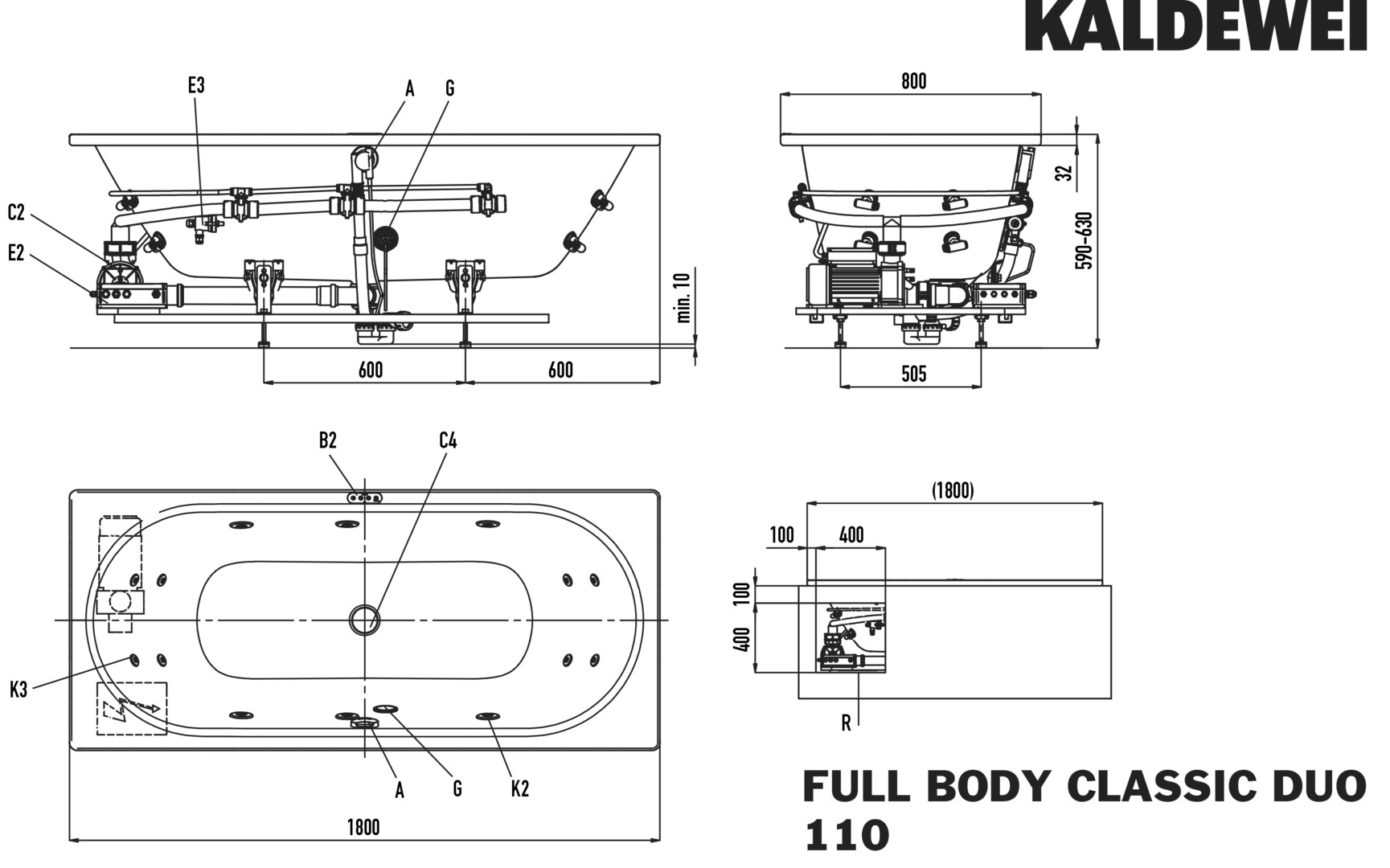 KALDEWEI CLASSIC DUO, Mod.110 FULL BODY 1800x800mm, schwarz matt 100, links, Sichtteile schwarz matt 100