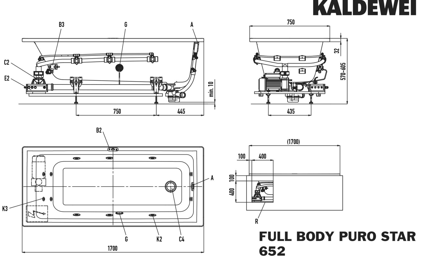KALDEWEI PURO, Mod.652 FULL BODY 1700x750mm, alpinweiß, Perl-Effekt, rechts, integrierter Einlauf, Sichtteile alpinweiß