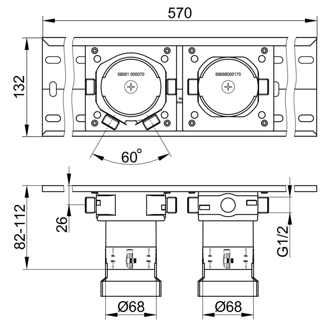 Grundkörper (595 51 00 00 70), mit Spüleinheit, Anschlussgewinde G 1/2, Einbautiefe: 80-110 mm, Grundkörper (595 56 00 01 70), mit Spüleinheit, Anschlussgewinde G 1/2, Einbautiefe 80-110 mm, Montageschiene (595 70 00 00 01), Montage senkrecht oder waagerecht, stufenlose Montage der Grundkörper