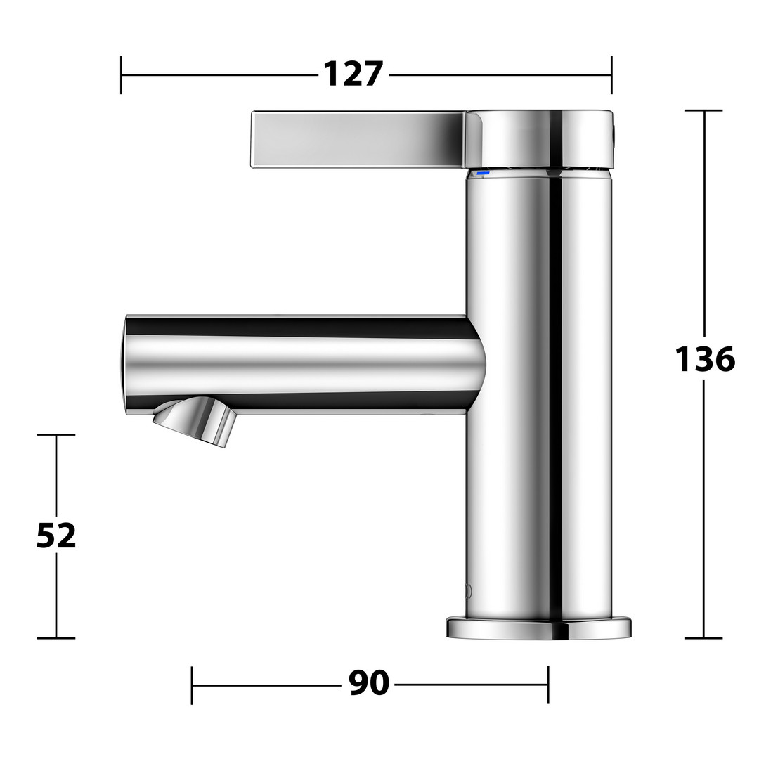 Auslaufhöhe 52 mm, Rosettenform rund/eckig, Einlochmontage mit Schnell-Montage-System, Anschlussart Anschlussschläuche G 3/8, Mischwasserkartusche mit keramischen Dichtscheiben, Luftsprudler M 20x1, Durchflussmenge begrenzt auf 7 l/min, für Durchlauferhitzer geeignet, geräuschgeprüft