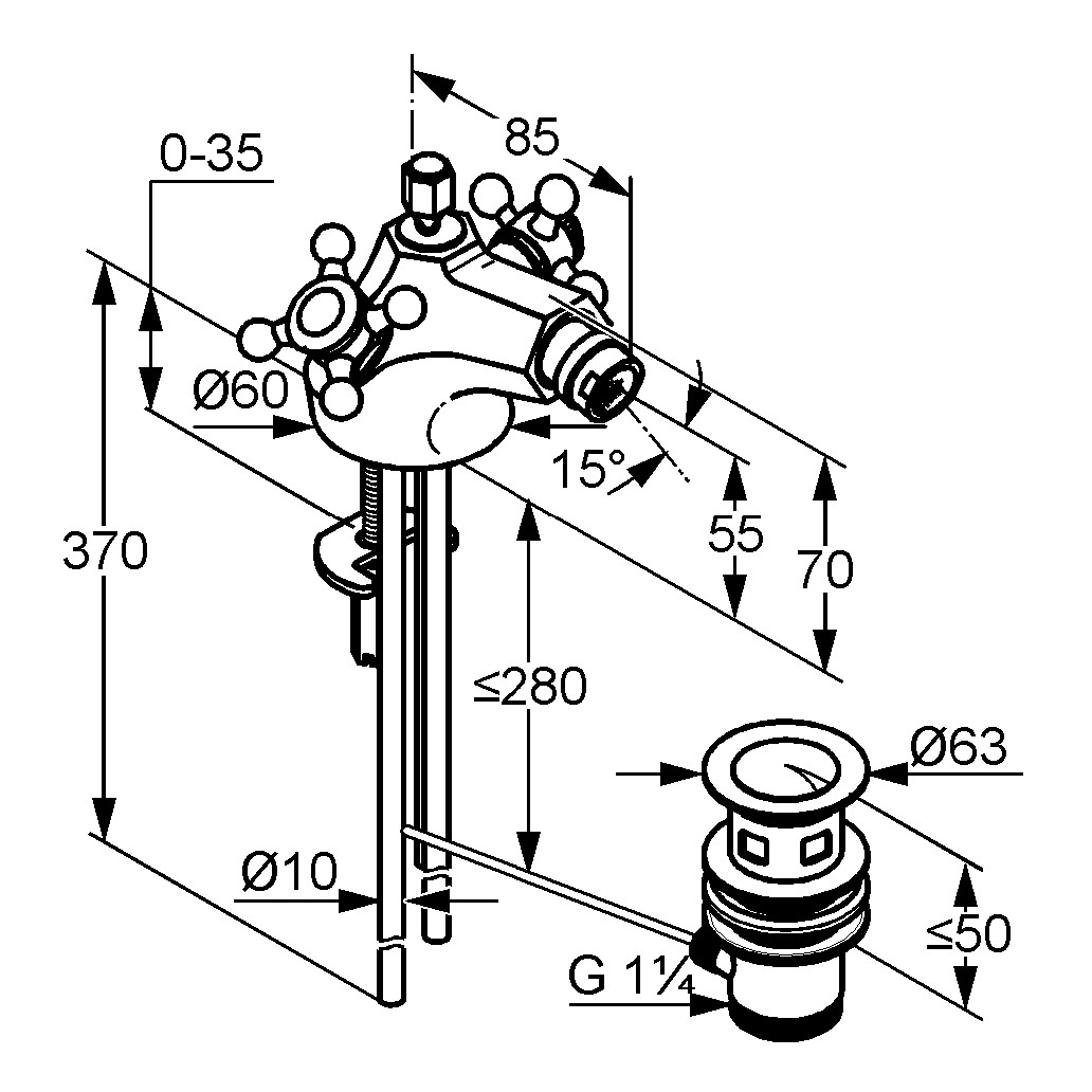 KLUDI 1926 Bidet-Zweigriff-Armatur Kreuzgriffe, mit Ablaufgarnitur, chrom W324728