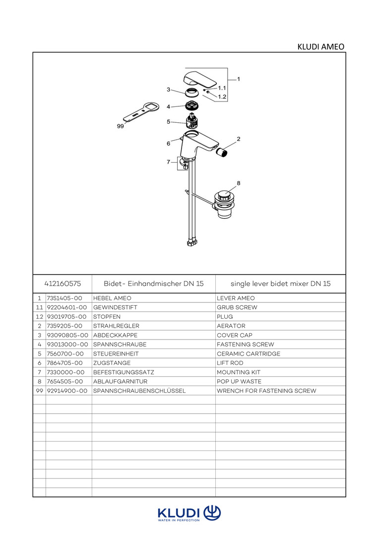 KLUDI Ameo Bidet-Einhebelmischer mit Ablaufgarnitur, Auslaufhöhe Unterkante 85mm, chrom
