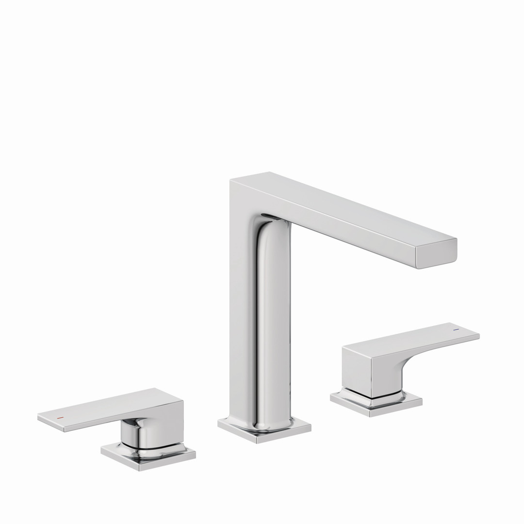 DN 15, geschlossener Hebel, Dreilochmontage, PCA Strahlregler M 18,5, Keramik-Oberteile 90°, Durchflussmenge 4,5 l/min bei 3 bar, fester Auslauf, Schnell-Montagesystem, Ablaufgarnitur G 1 1/4