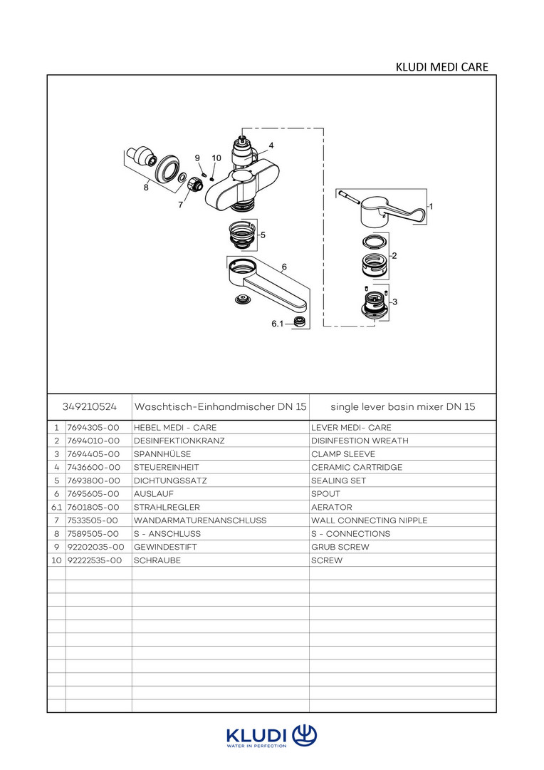 KLUDI Medi-Care Waschtisch-Wand-Einhebelmischer Klinik-Armhebel, Ausladung 245mm, absperrbare S-Anschlüsse, chrom