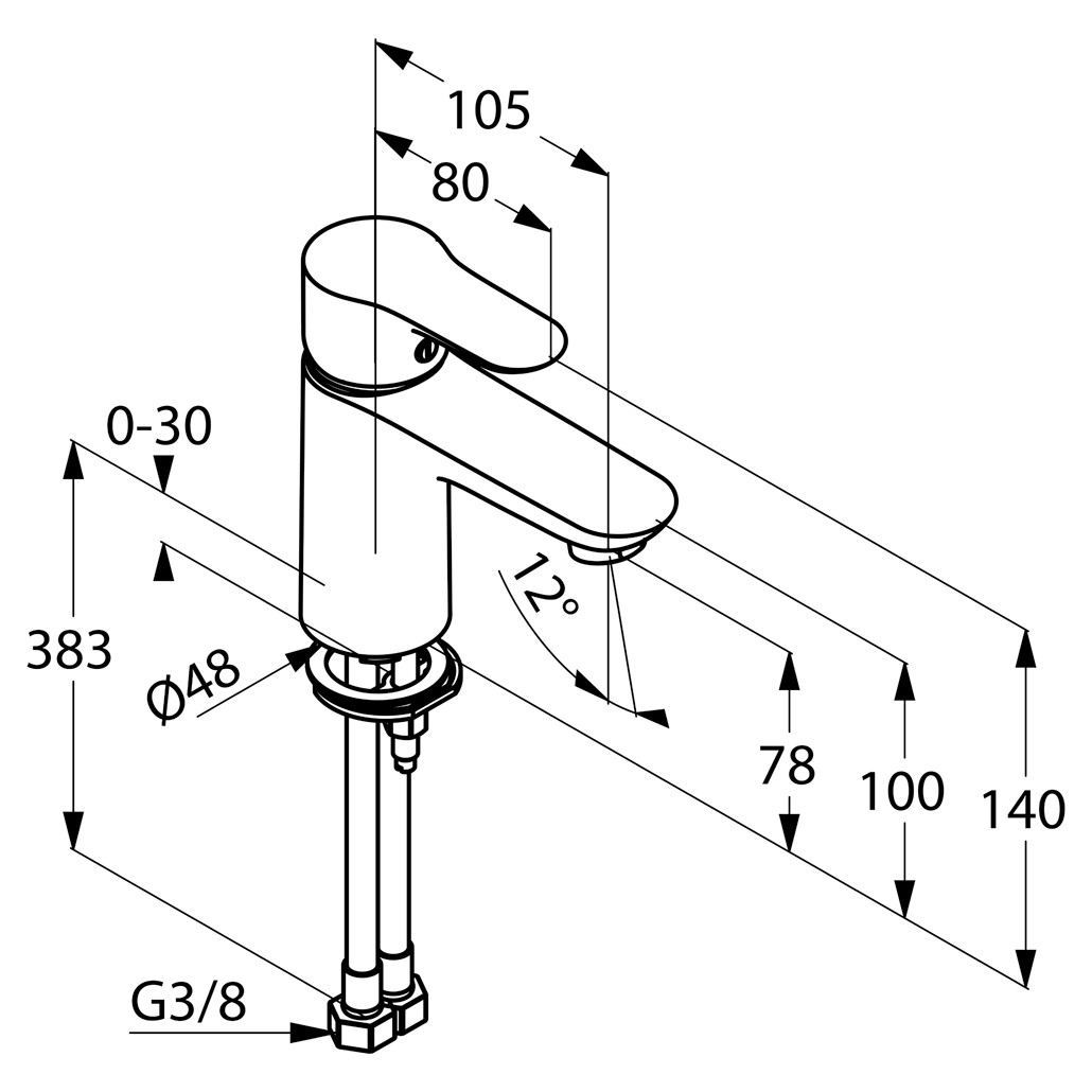 DN 15, geschlossener Hebel, Einlochmontage, Keramik-Kartusche mit Heißwasserbegrenzung, PCA s-pointer Luftsprudler M 24 x 1, Durchflussmenge 5 l/min bei 3 bar, Schnell-Montagesystem, flexible Anschlüsse G 3/8, Auslaufhöhe Unterkante 80 mm