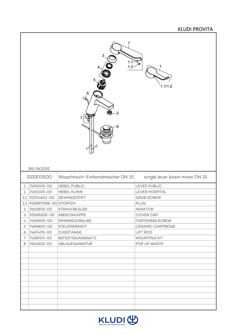 KLUDI PROVITA Waschtisch-Einhebelmischer mit Ablaufgarnitur, ohne Hebel, starrer Auslauf, chrom