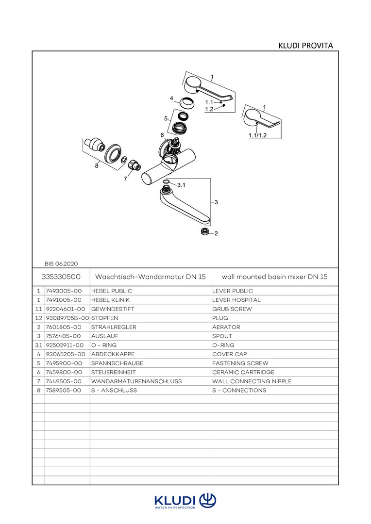 DN 15, wahlweise für KLINIK- oder PUBLIC-Hebel, Wandmontage, Durchflussmenge 7,6 l/min bei 3 bar, PCA Cara-Strahlregler M 24 x 1, Keramik-Kartusche mit Heißwasserbegrenzung, schwenkbarer oder arretierbarer Auslauf, S-Anschlüsse, 335310500/335330500/335370500 mit absperrbaren S-Anschlüssen, P-IX 19335/IZ