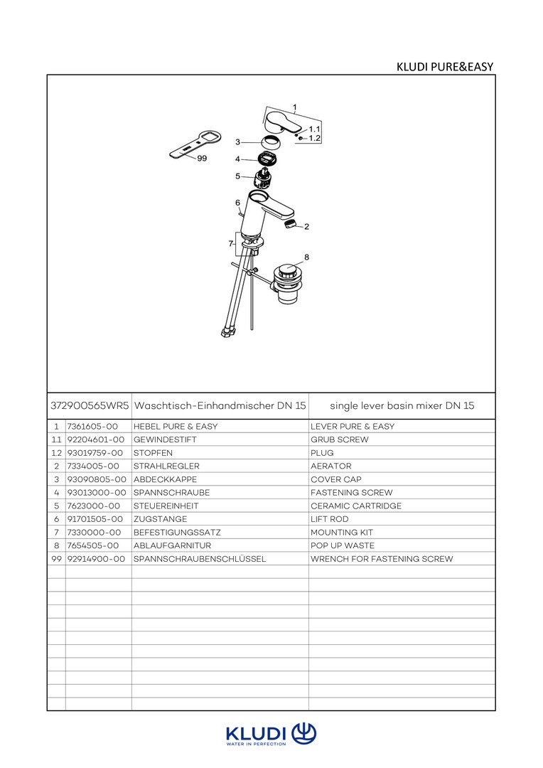 KLUDI PURE&EASY Waschtisch-Einhebelmischer 100 DN 15, mit Metall-Ablaufgarnitur, chrom