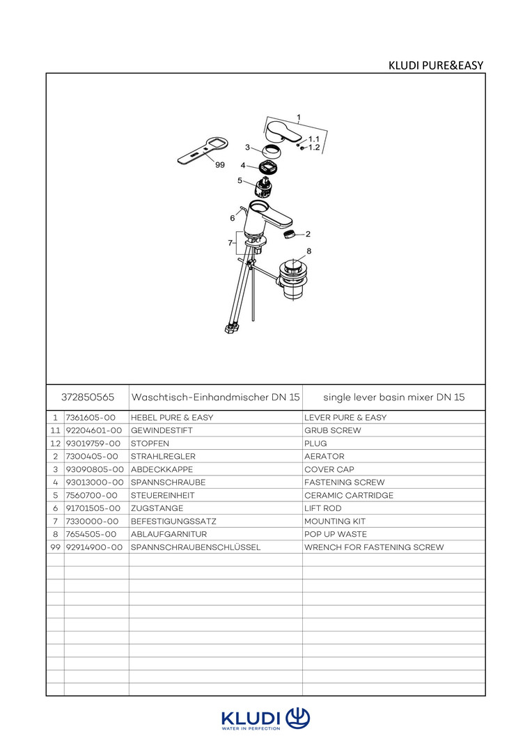 KLUDI PURE&EASY Waschtisch-Einhebelmischer 60 DN 15, mit Kunststoff-Ablaufgarnitur, chrom