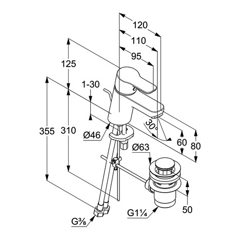 Einlochmontage, geschlossener Hebel, Keramik-Kartusche mit Heißwasserbegrenzung, Strahlregler M 24 x 1, Durchflussmenge 5 l/min. bei 3 bar, Ablaufgarnitur G 1 1/4 aus Kunststoff, flexible Anschlüsse G 3/8, Schnell-Montagesystem, Auslaufhöhe Unterkante 60 mm