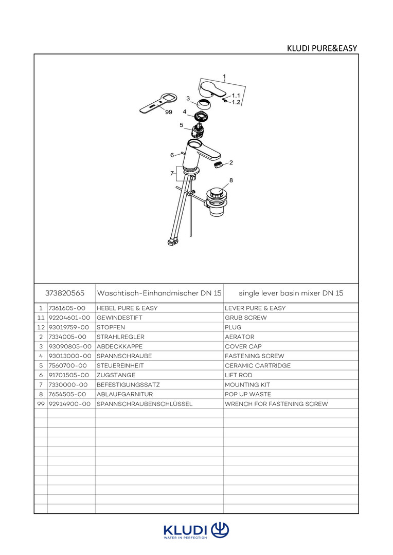 KLUDI PURE&EASY Waschtisch-Einhebelmischer 70 DN 15, mit Metall-Ablaufgarnitur, chrom
