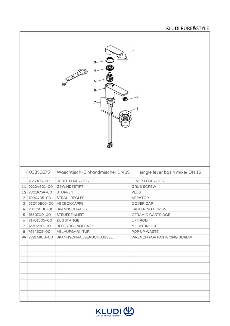 KLUDI PURE&STYLE Waschtisch-Einhebelmischer 60 mit Metall-Ablaufgarnitur, chrom