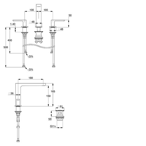 DN 15 , Dreilochmontage, PCA Strahlregler M 18,5, Keramik-Oberteile 90°, Durchflussmenge 4,5 l/min bei 3 bar, fester Auslauf, Schnell-Montagesystem, Ablaufgarnitur G 1 1/4