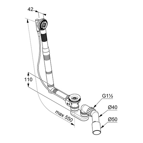 mit Bowdenzug für Bade- und tiefe Brausewannen, mit festem Geruchverschluss, 2 Drehgelenke, 50 mm Wasser-Verschlusshöhe, nach DIN EN 274, mit Anschlussstutzen DN 40/50, ohne Feinbau-Set, mit Exzentergarnitur