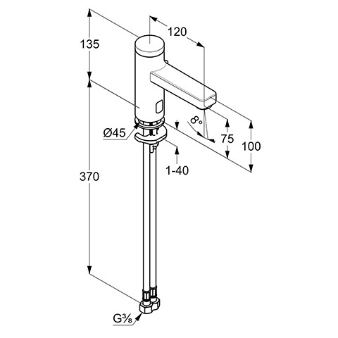 DN 15, Einlochmontage, Durchflussmenge 5 l/min bei 3 bar, PCA Cascade-Luftsprudler M 24 x 1, mit Kartuschenventil, optischer Gegenstandserfassung, Elektronikmodul, Stromversorgung über 230 V Netzgerät, Rückflussverhinderer, Schnell-Montagesystem, flexible Anschlüsse, mit Schmutzfangsieben G 3/8, Auslaufhöhe Unterkante 75 mm