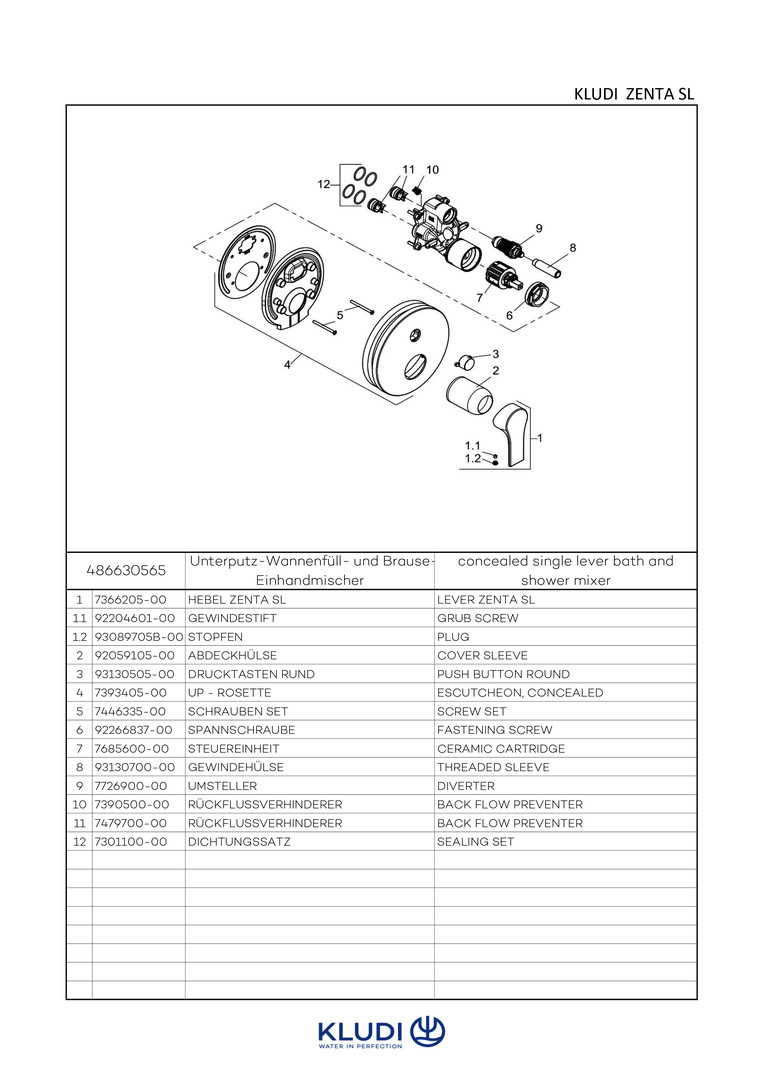 KLUDI ZENTA SL Fertigmontageset UP-Wannenfüll- und Brause-Einhebelmischer, eigensicher gegen Rückfließen, chrom