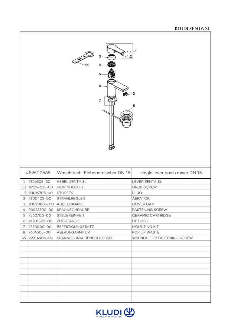 KLUDI ZENTA SL Waschtisch-Einhebelmischer mit Ablaufgarnitur, Auslaufhöhe Unterkante 75mm, chrom