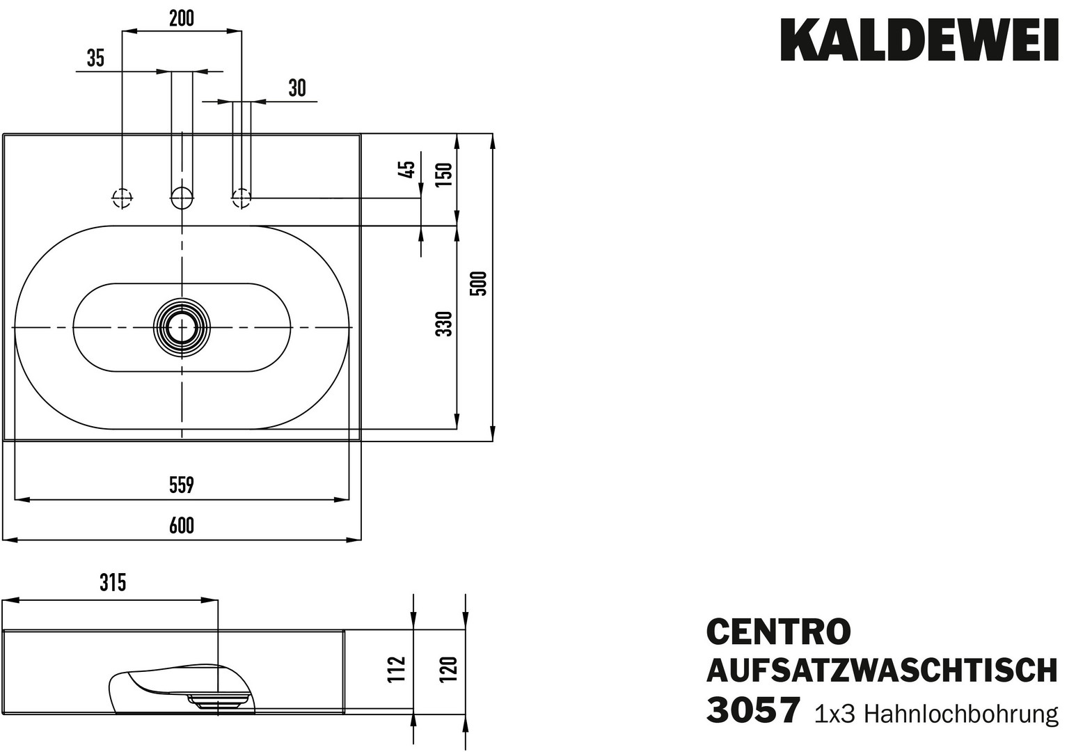 Kaldewei Aufsatz-Waschtisch CENTRO 3057 60x50cm, 3 Hahnloch, Perl-Effekt, schwarz