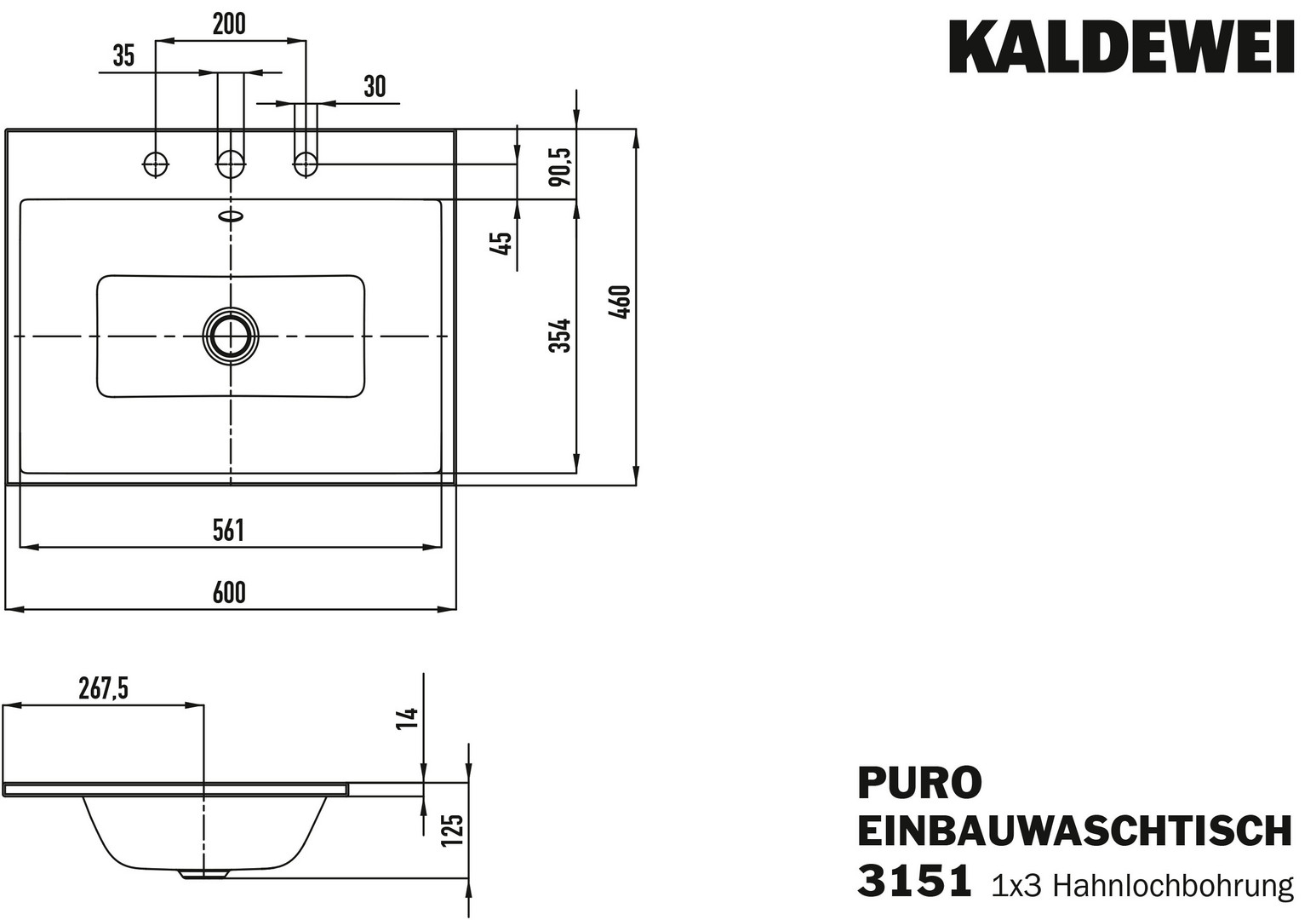 Kaldewei Einbau-Waschtisch PURO 3151 60x46cm, 1 Hahnloch, chrom, Perl-Effekt, weiß W44374