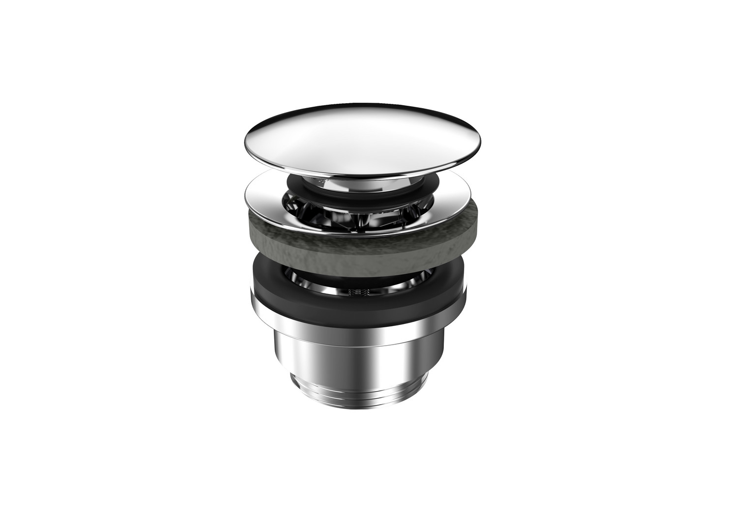 verschließbares Ablaufventil G 1 1/4 AG mit Klickverschluss für Waschtisch mit Überlauf, Push-to-open Waschtischablaufventil, Oberteil Messing verchromt, Unterteil Kunststoff verchromt, Ø 62 mm, G 1 1/4 AG, entspricht DIN EN 274, Ablaufleistung 36 l/min (ohne Geruchverschluss)