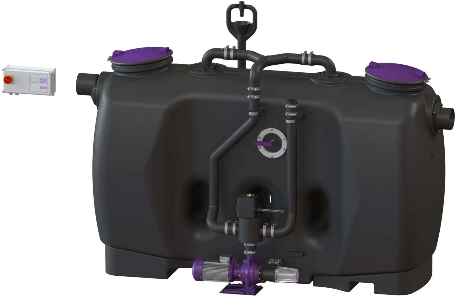 aus PE, Einbau in frostgeschützten Räumen, mit programmgesteuerter Entsorgungs- und Reinigungseinrichtung, Schredder-Mix-System, Schaltgerät, Schauglas, Fülleinrichtung, Pumpe und Trinkwasserspülung, die Fließrichtung kann durch Austauschen des Zu- und Ablaufstutzens geändert werden, Pumpenleistung 3 kW, Kabellänge für Anbauteile 5 m, Anlage komplett montiert, Zubehör Probeentnahmeeinrichtung, Hebeanlagen, Fernbedienung