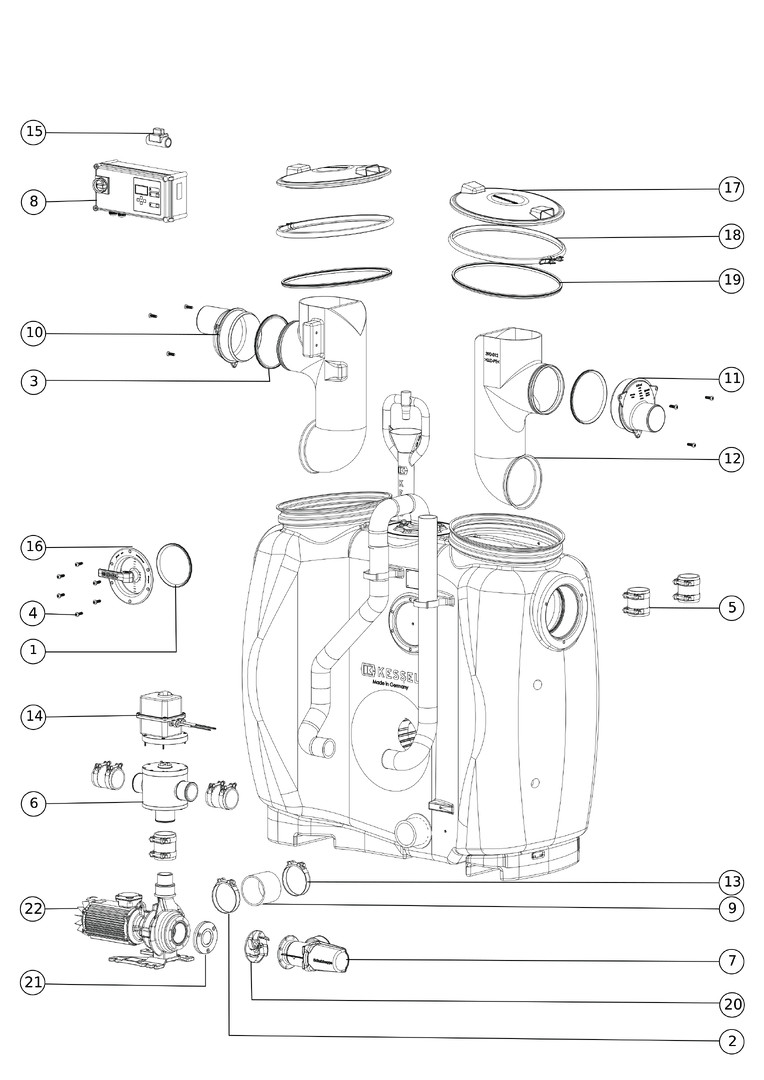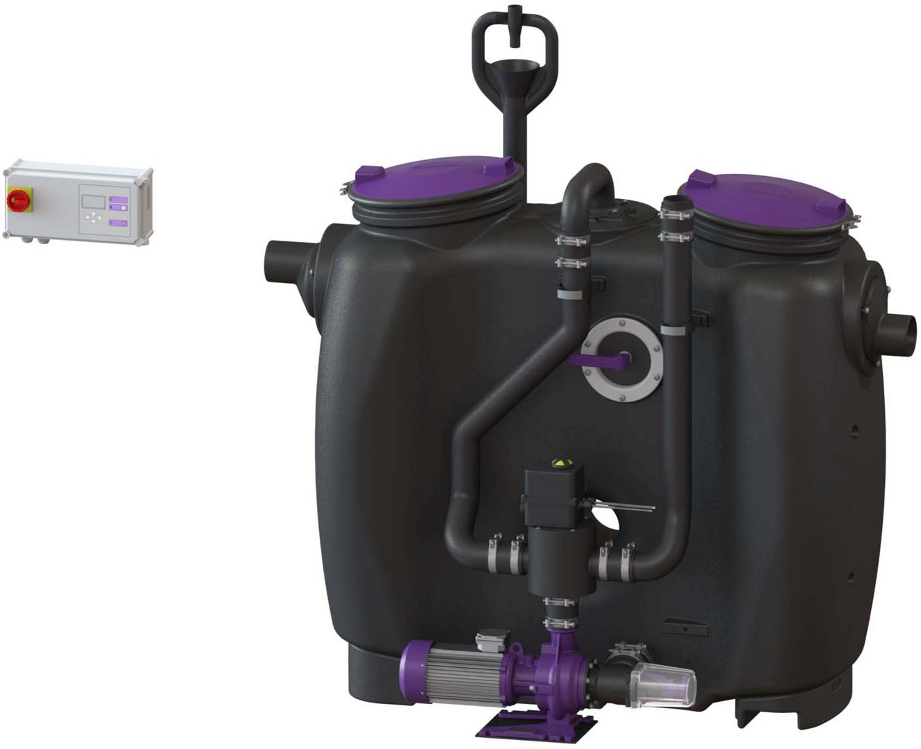 aus PE, Einbau in frostgeschützten Räumen, mit programmgesteuerter Entsorgungs- und Reinigungseinrichtung, Schredder-Mix-System, Schaltgerät, Schauglas, Fülleinrichtung, Pumpe und Trinkwasserspülung, die Fließrichtung kann durch Austauschen des Zu- und Ablaufstutzens geändert werden, Pumpenleistung 3 kW, Kabellänge für Anbauteile 5 m, Anlage komplett montiert, Zubehör Probeentnahmeeinrichtung, Hebeanlagen, Fernbedienung