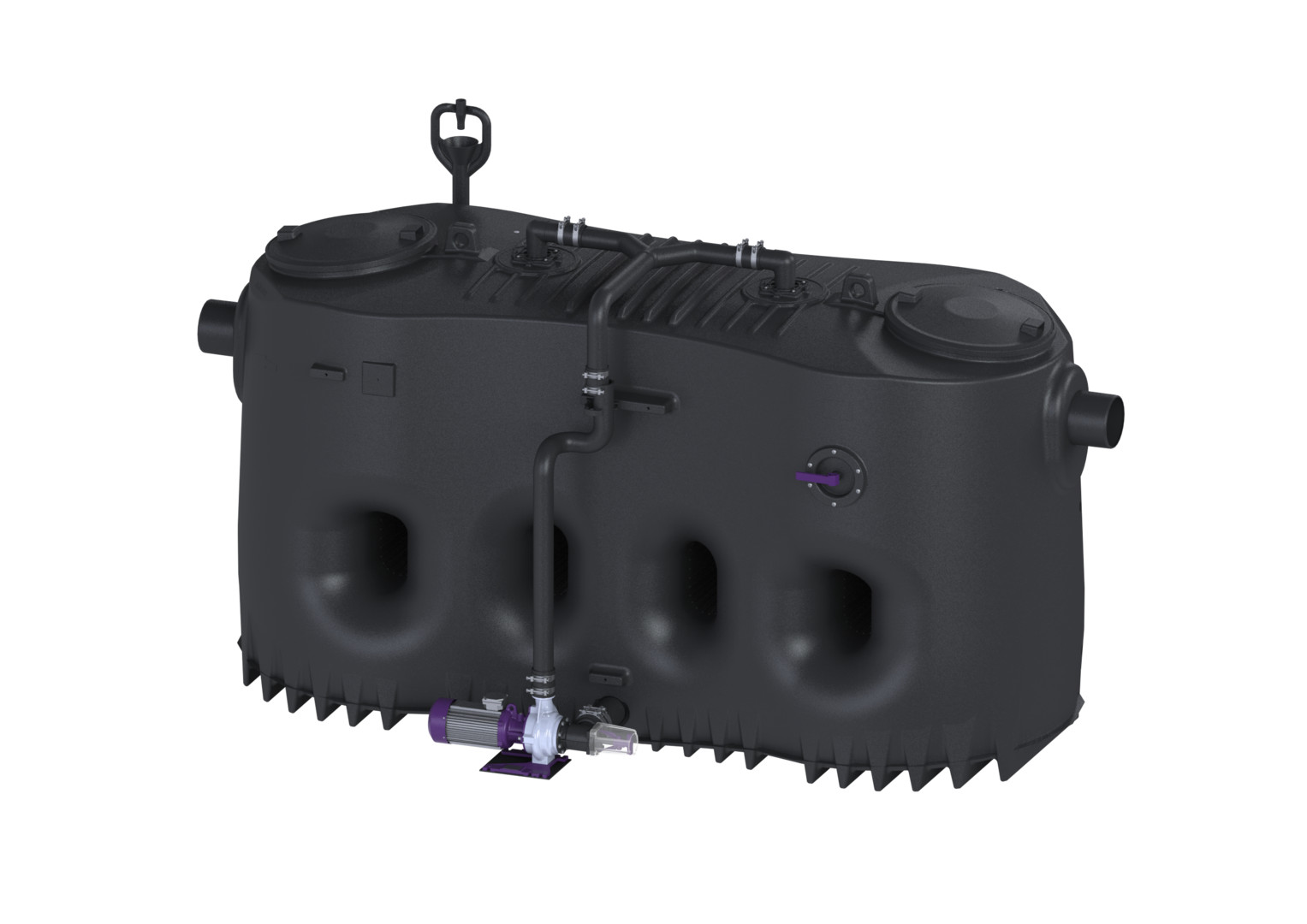 aus PE, Einbau in frostgeschützten Räumen, mit Direktentsorgung, programmgesteuertem Schredder-Mix-System, Schaltgerät, Schauglas, Fülleinrichtung und Pumpe, die Fließrichtung kann durch Austauschen des Zu- und Ablaufstutzens geändert werden, Pumpenleistung 3 kW, Kabellänge für Anbauteile 5 m, Anlage komplett montiert, Zubehör Probenahmeeinrichtung, Hebeanlagen, Fernbedienung