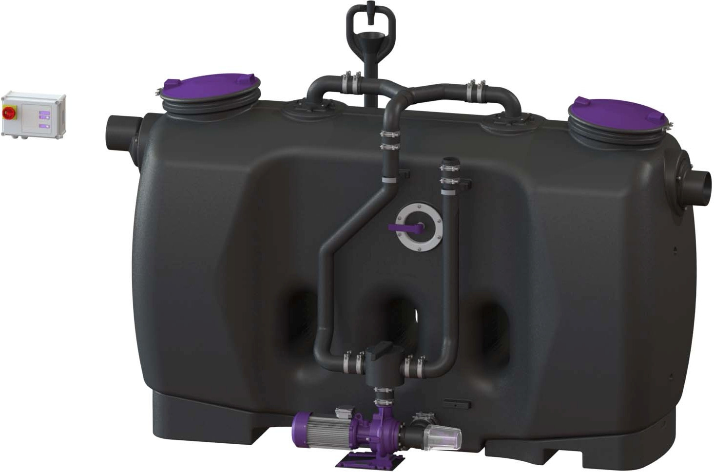 aus PE, Einbau in frostgeschützten Räumen, mit manueller Entsorgungs- und Reinigungseinrichtung, Schredder-Mix-System, Schaltgerät, Schauglas, Fülleinrichtung und Pumpe, die Fließrichtung kann durch Austauschen des Zu- und Ablaufstutzens geändert werden, Pumpenleistung 3 kW, Kabellänge für Anbauteile 5 m, Anlage komplett montiert, Zubehör Probenahmeeinrichtung, Hebeanlagen