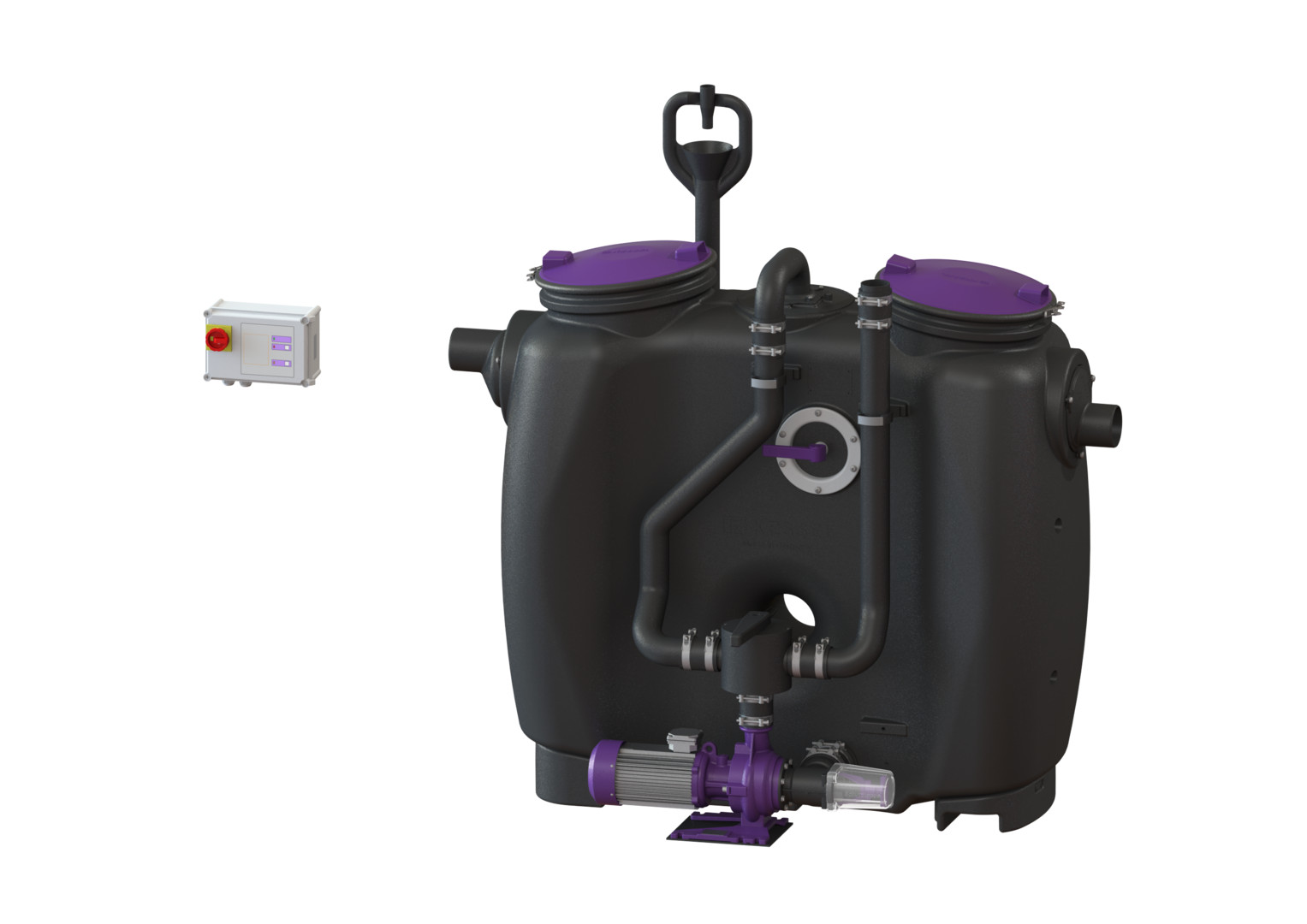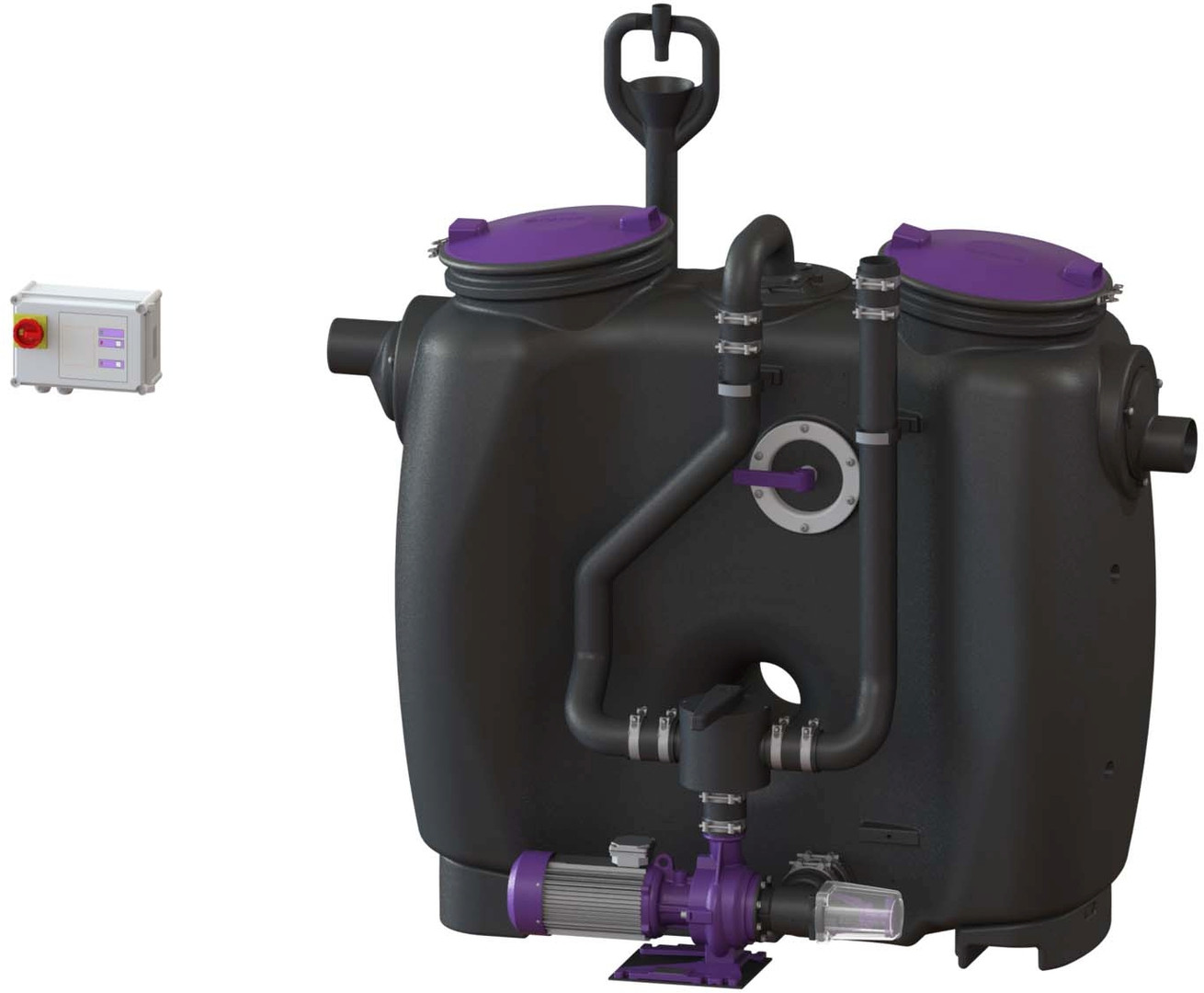 aus PE, Einbau in frostgeschützten Räumen, mit manueller Entsorgungs- und Reinigungseinrichtung, Schredder-Mix-System, Schaltgerät, Schauglas, Fülleinrichtung und Pumpe, die Fließrichtung kann durch Austauschen des Zu- und Ablaufstutzens geändert werden, Pumpenleistung 3 kW, Kabellänge für Anbauteile 5 m, Anlage komplett montiert, Zubehör Probenahmeeinrichtung, Hebeanlagen