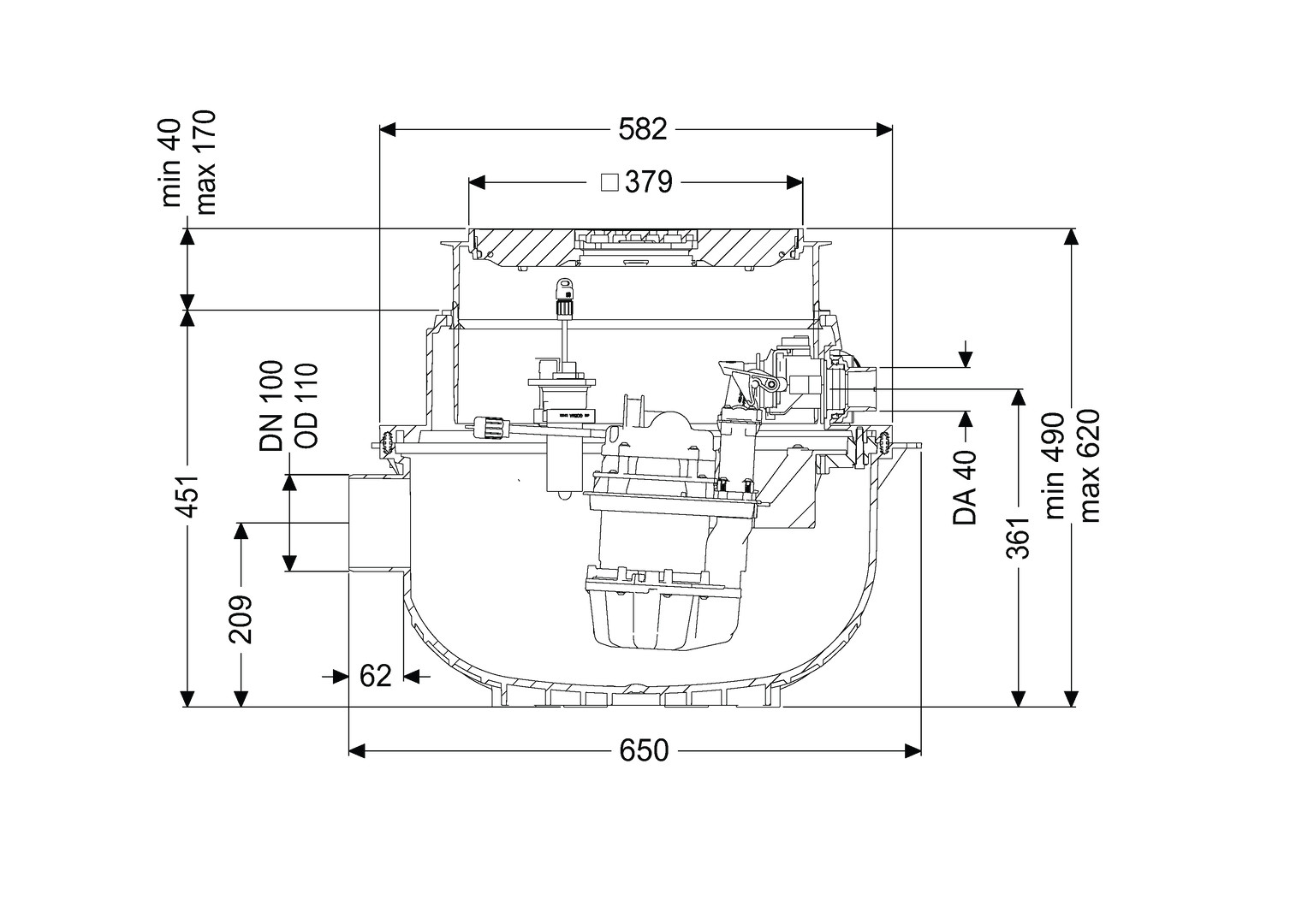 zum Einbau in die Bodenplatte, Kunststoff, mit Freistromrad, Pumpe Typ GTF, mit pneumatische Niveauerfassung, entnehmbar, Comfort-Schaltgerät, Display, USB-Schnittstelle und Selbstdiagnosesystem SDS, Anlage steckerfertig, Stutzen für Zulauf und Kabelleerrohr, teleskopisches Aufsatzstück mit integrierter Ablauffunktion und Flansch für Abdichtung im Verbund, Druckleitung DN 32/OD 40, Pumpe GTF 500 Behältervolumen 65 l, Nutzvolumen 20 l, Fördermenge max. 10 cbm/h, Förderhöhe max. 8 m, Pumpe GTF 1200 Behältervolumen 65 l, Nutzvolumen 20 l, Fördermenge max. 15,5 cbm/h, Förderhöhe max. 9 m, Pumpe GTF 500 resistant beständig gegen salzhaltige Medien, Abwasser aus Enthärtungsanlagen sowie kondensathaltiges Abwasser aus Heizungsanlagen, Klasse K 3, Kabellänge 5 m, Einbautiefe 490-620 mm, Aussparungsmaße 700 × 700 mm