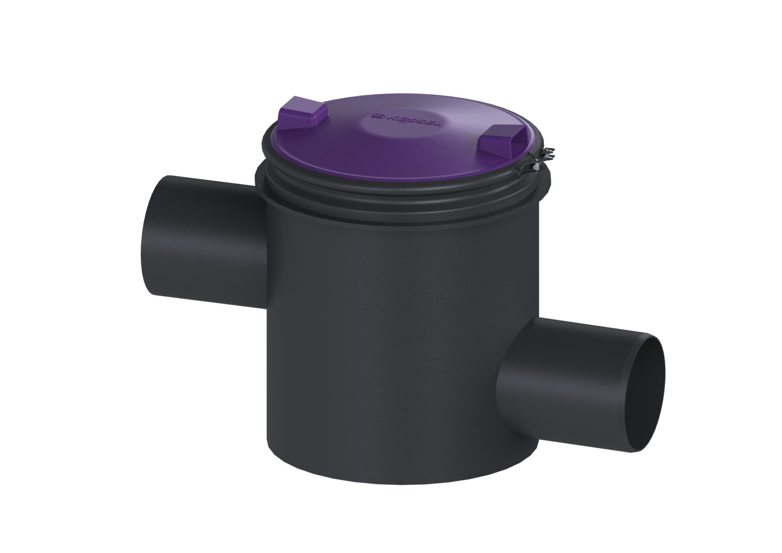 aus Kunststoff, zum Anschluss an die Ableitung von Abscheideanlagen, leerlaufend, Zu- und Auslauf DN 100/150 frei wählbar für Kunststoff-Rohre aus PE-HD (nach DIN 19537), PVC-HT, PP oder AS, mit Deckel mit Schnellspannverschluss geruchsdicht verschlossen, Absturzhöhe 120 mm